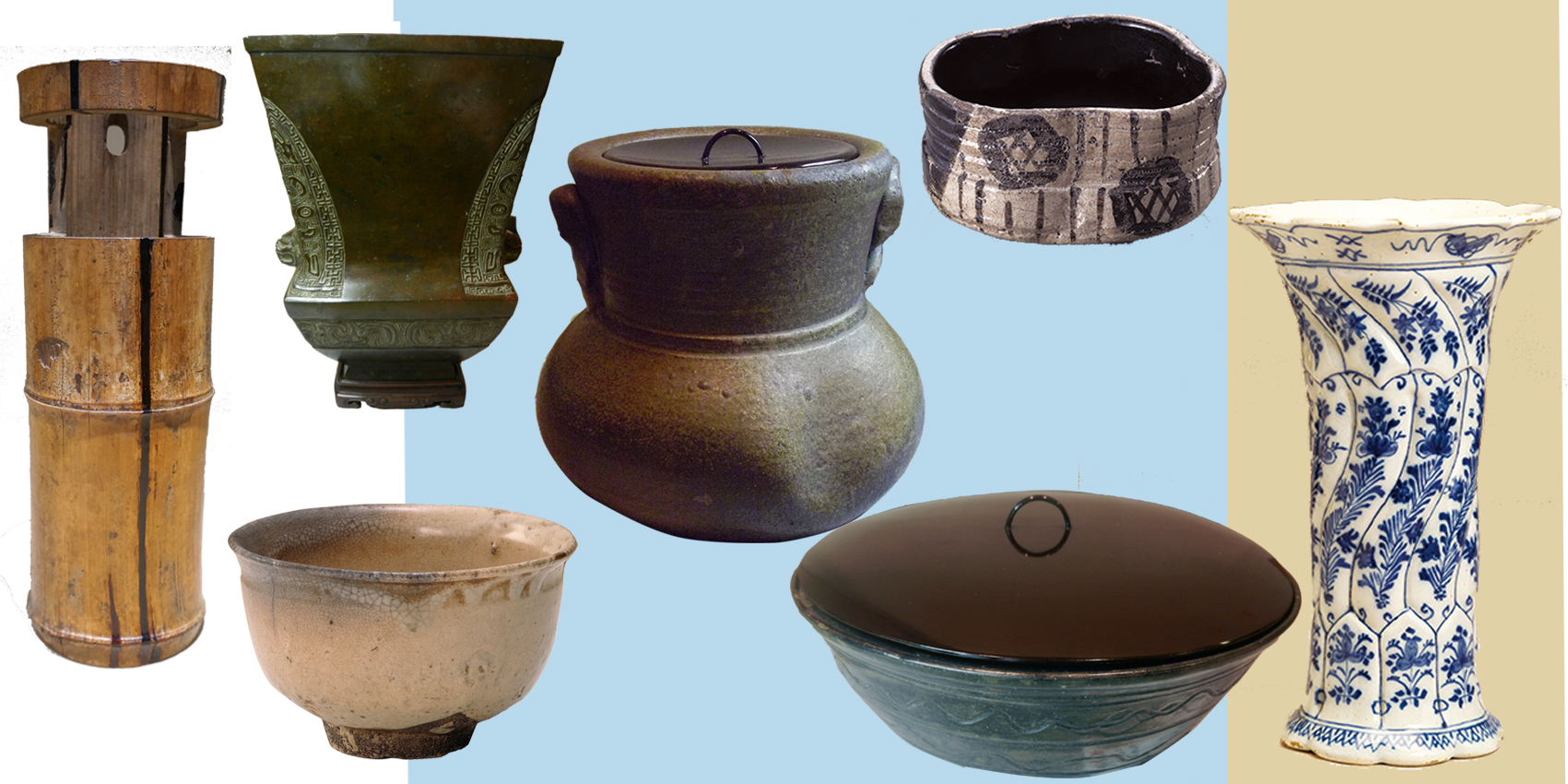 抹茶を点てて飲むための茶碗、水を入れるためのうつわである水指、花を生けるため水を入れる花入のそれぞれが水を包み、たたえるように工夫された姿をご紹介します。 水を包む茶道具の多彩なすがたや、茶道具に見られる感性の豊かさをお楽しみください。 |展示予定品| 品名 作者等 | 制作年代 阿蘭陀染付捻花入| オランダデルフト窯 17世紀 | 鬼熊川茶碗 銘「薄柿」|朝鮮 17世紀 |展示期間 3/20~5/8 黒織部茶碗 銘「板庇」|桃山時代| 備前福耳水指 | 江戸時代 | ほか(全約40点を展示予定) 3/20~5/8,5/12~7/10で一部展示品の入替えを行ないます。 |
